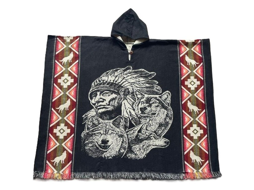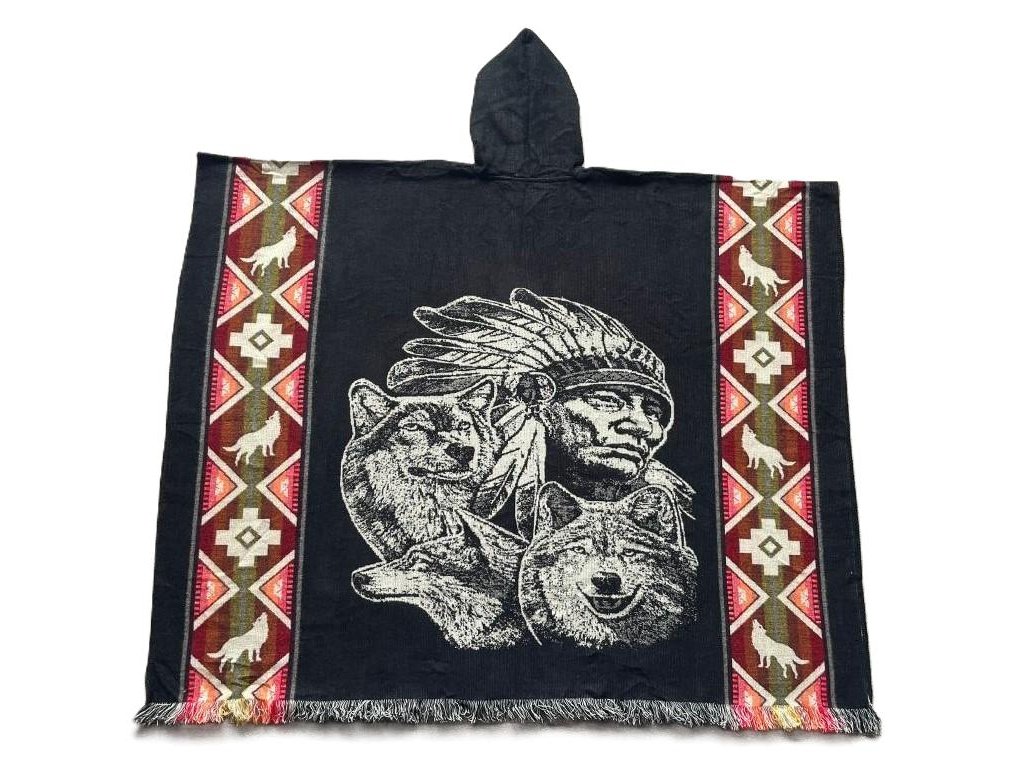 Pončo INDIÁN se TŘEMI VLKY černé